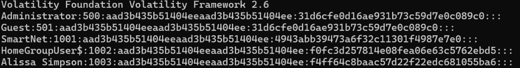 명령어: .\volatility_2.6_win64_standalone\volatility_2.6_win64_standalone.exe -f .\MemLabs-Lab1\MemoryDump_Lab1.raw --profile=Win7SP1x64 hashdump