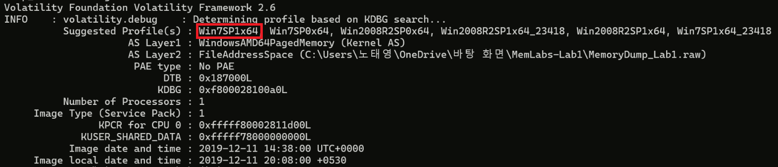 명령어: .\volatility_2.6_win64_standalone\volatility_2.6_win64_standalone.exe -f .\MemLabs-Lab1\MemoryDump_Lab1.raw imageinfo