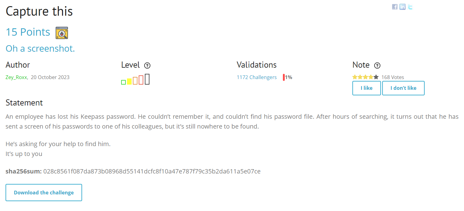 challenge를 다운받고 압축을 풀어보니 Capture.png와 Database.kdbx 파일이 있었다. Database.kdbx는 keepass로 열어야 하는 확장자다. keepass로 열어보니 암호가 걸려있었고 그 암호를 찾아야 하는 문제라는 것을 알았다.