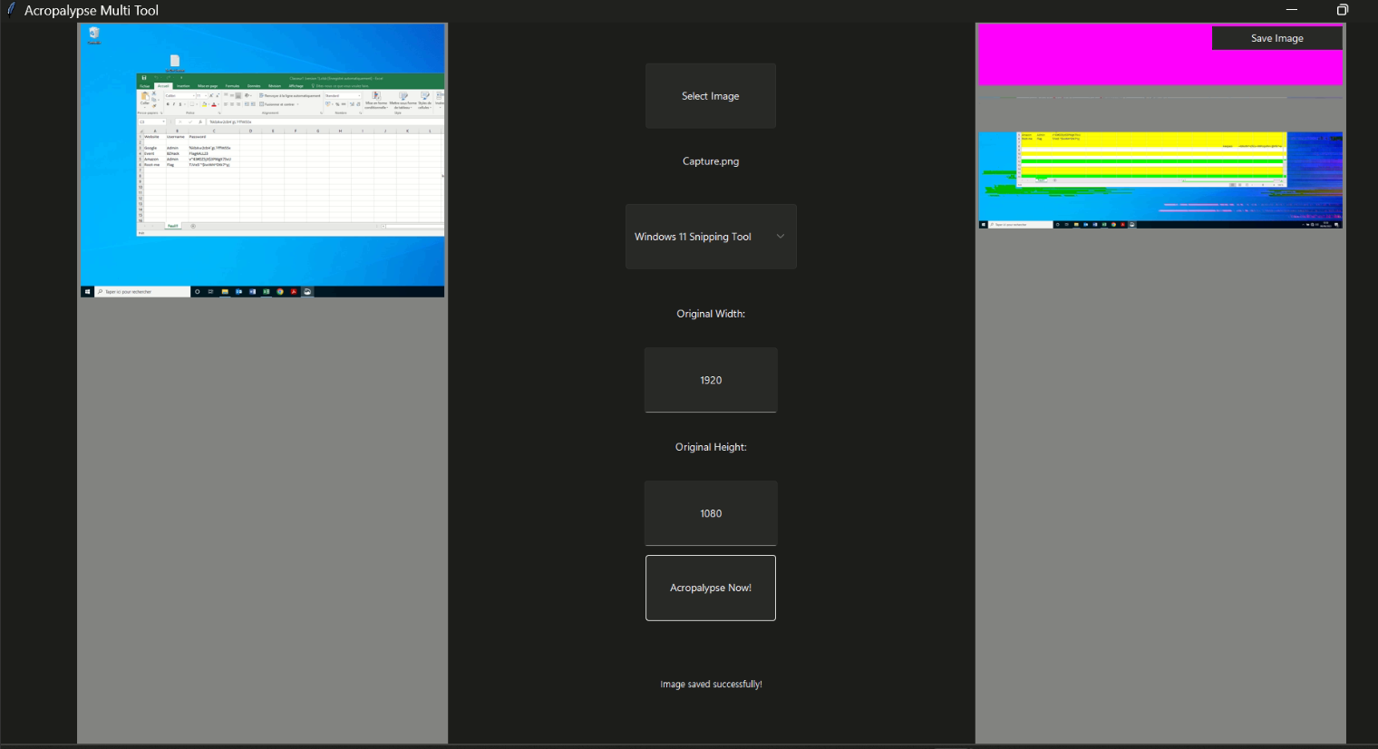 Restoring Tool을 클릭 시키고 Capture.png를 넣고 Window11 snipping Tool을 선택 하고 Acopalypse Now!를 실행시키니 아래와 같이 나오는것을 확인했다.