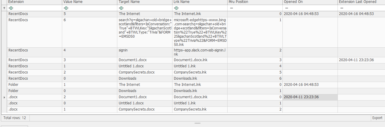 해당 문제를 풀기 위해서는 NTUSER.DAT\Software\Microsoft\Windows\CurrentVersion\Explorer\RecentDocs 를 확인해주면 된다. 다만 어떤 사용자의 NTUSER.DAT을 추출해야 할 지 모르기에 모두 다 추출해주었고 하나하나 비교해주었다.