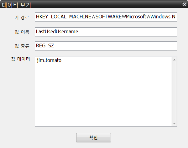 HKEY_LOCAL_MACHINE\SOFTWARE\Microsoft\Windows NT\CunrrentVersion\Winlogon을 확인하면 LastUsedUsername을 확인 할 수 있다.