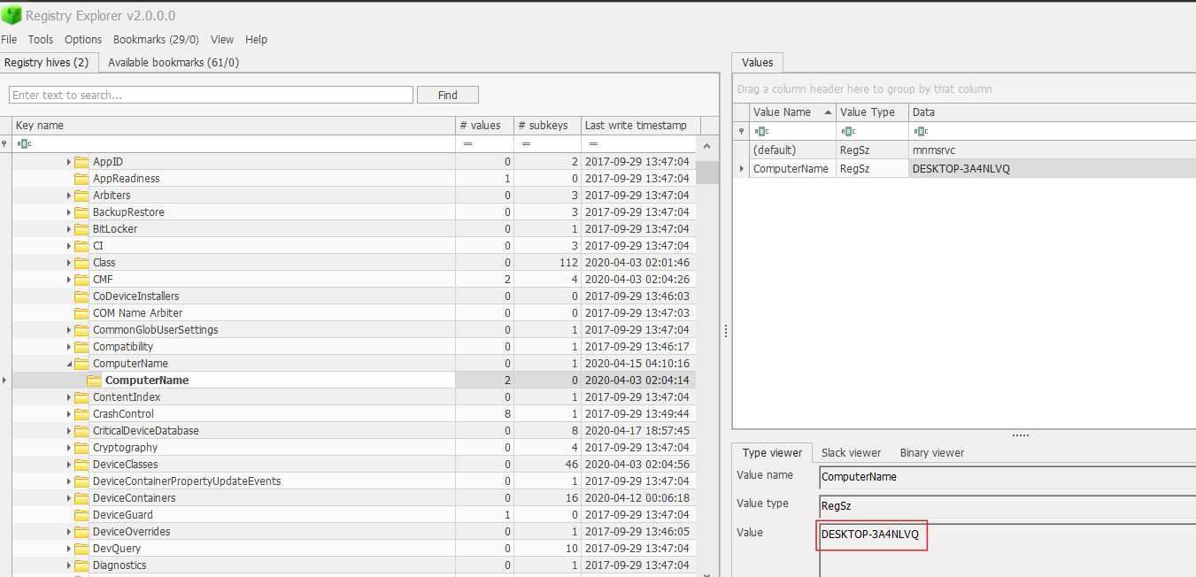 Registy Explorer에서 ROOT-ControlSet001-Control-ComputerName-ComputerName을 확인 하면 알 수 있다.