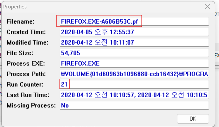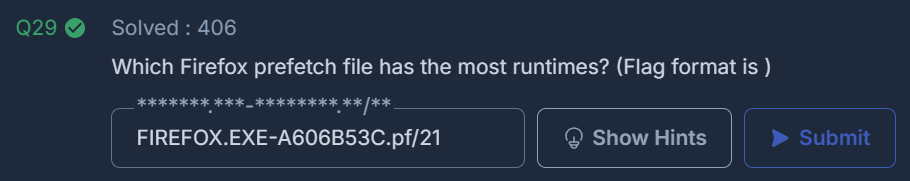 winprefetchview를 통해 firefox 를 확인했고 가장 run counter가 많은 것을 답에 넣어줬다.
