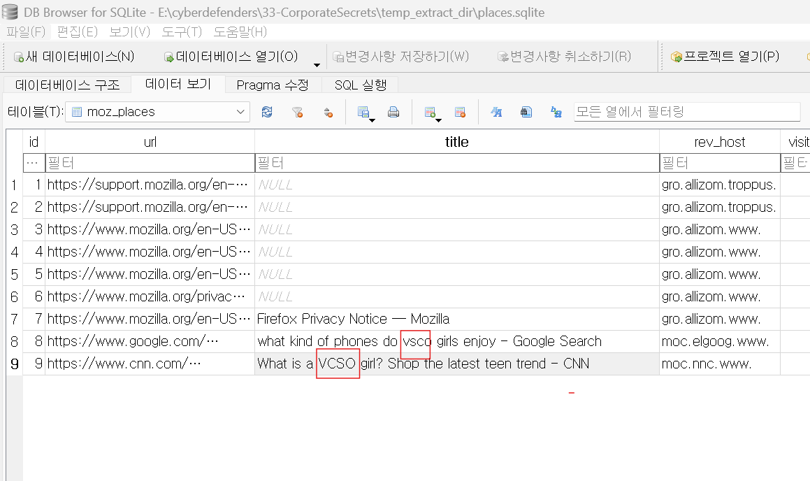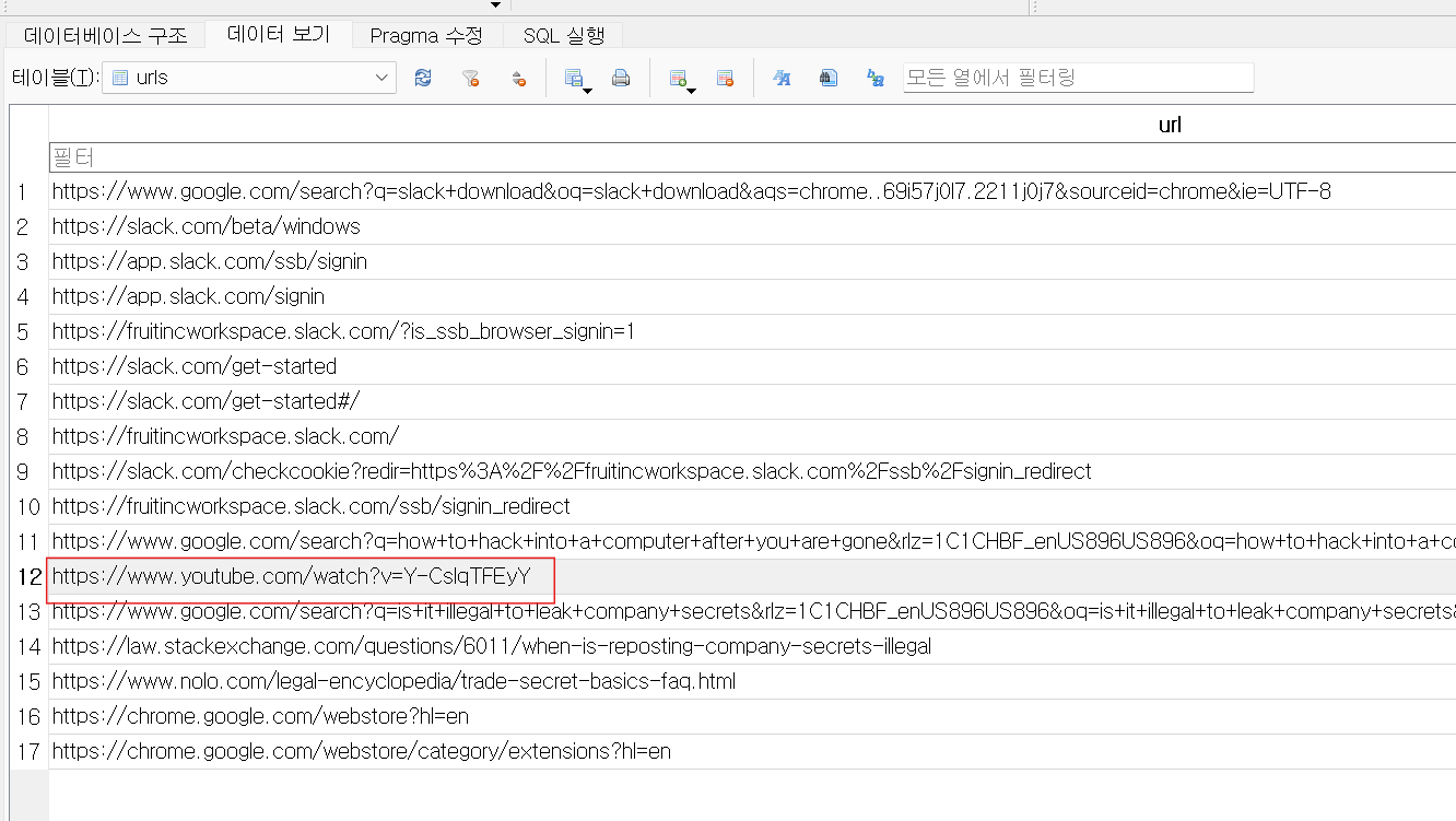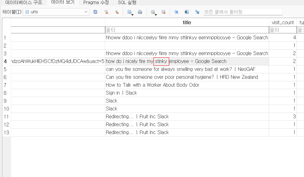 경로의 파일을 추출하여 sqlite에 넣고 확인해보니 특정 단어를 검색한 history를 확인할 수 있었다.