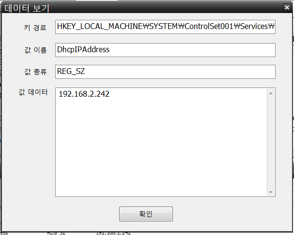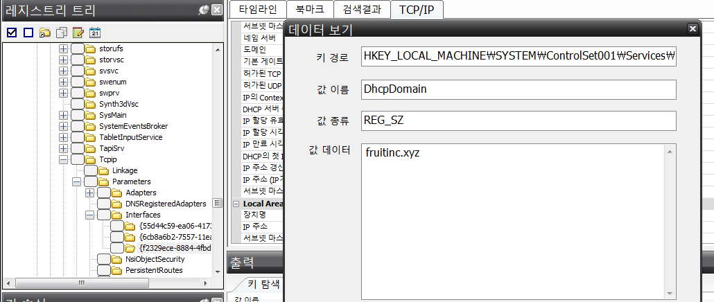 DHCP 도메인 정보는 HKEY_LOCAL_MACHINE\SYSTEM\CurrentControlSet\Services\Tcpip\Parameters\Interfaces\