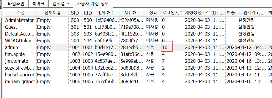 REGA 도구를 통해 사용자 계정정보를 확인하면 로그인한 횟수를 알 수 있다.
