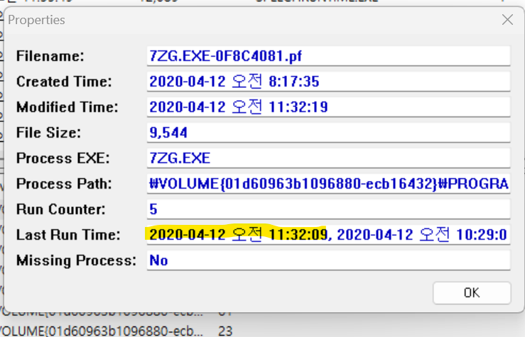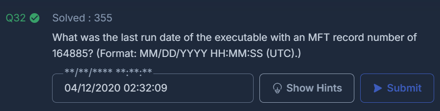 이후 해당 파일의 프리패치를 확인하여 가장 마지막으로 실행된 시간을 확인했고 프리패치에 UTC+9가 되어있기에 9시간을 빼준 뒤 답을 입력했다.