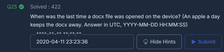 When was the last time a docx file was opened on the device? (An apple a day keeps the docx away. Answer in UTC, YYYY-MM-DD HH:MM:SS)