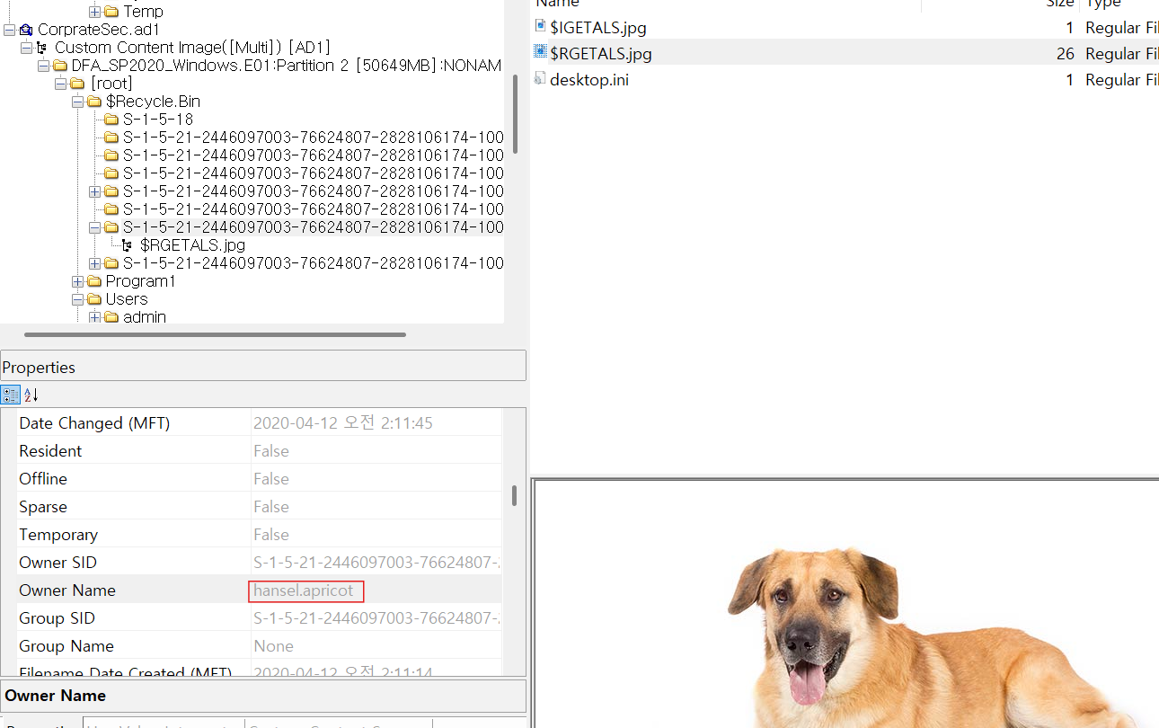 개 이미지를 찾기 위해 $Recycle.Bin에서 하나하나 찾아봤다.