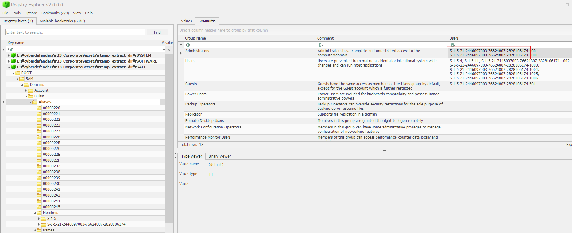 해당 문제를 알기 위해선 사용자 그룹 정보에 대한 내용이 포함되어있는 sam 레지스트리를 추출하여 Registry Explorer에 넣어주었고 아래와 같은 경로로 이동해 확인해 주었다.
