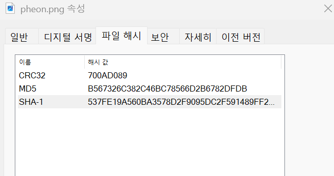 해당 이미지 내에는 png 파일이 스테가노그래피 되어있는것을 알 수 있었고 해당 이미지를 새로 저장 후 SHA-1 값을 확인해 주었다.