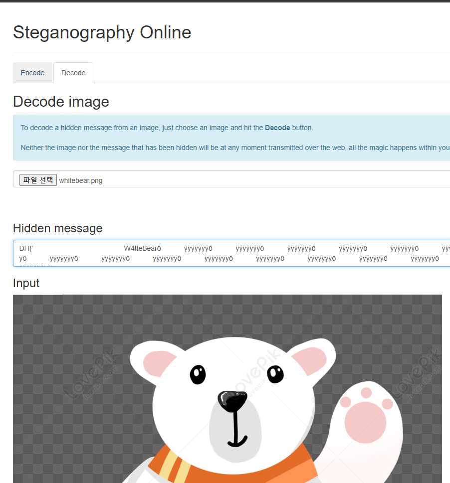 관련 도구는 다양하지만, 간단하게 온라인에서 스테가노그래피를 처리할 수 있는 도구 https://stylesuxx.github.io/steganography/를 사용했다