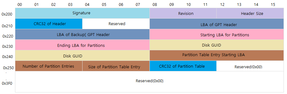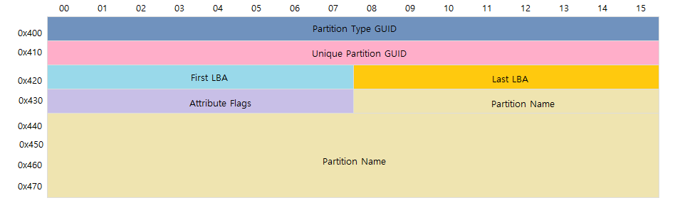 | Partition Type GUID | 0x400 | 16 | 파티션 유형 식별값 |