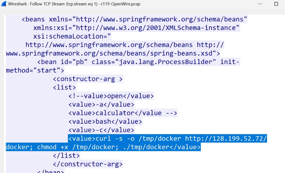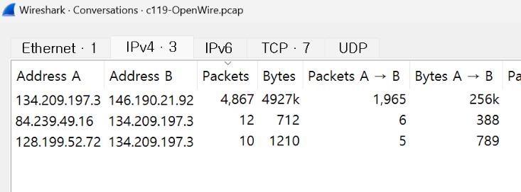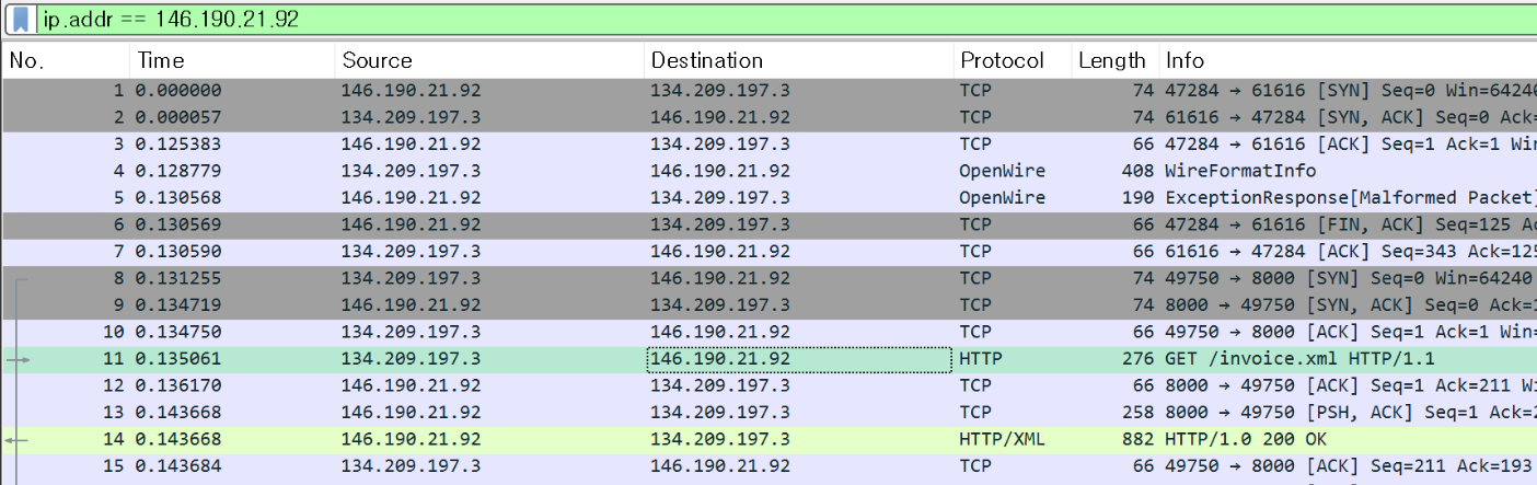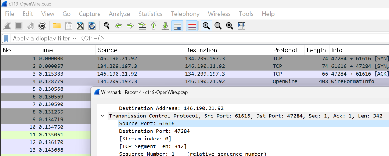 아래 사진을 보면 C2 서버와 공격자 주소간 openwire protocol을 사용한 패킷이 있었다.