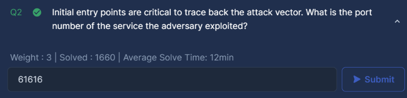 Initial entry points are critical to trace back the attack vector. What is the port number of the service the adversary exploited?