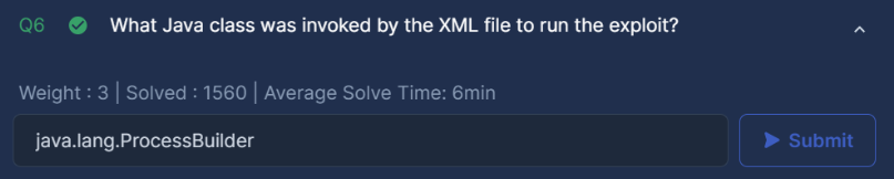 What Java class was invoked by the XML file to run the exploit?