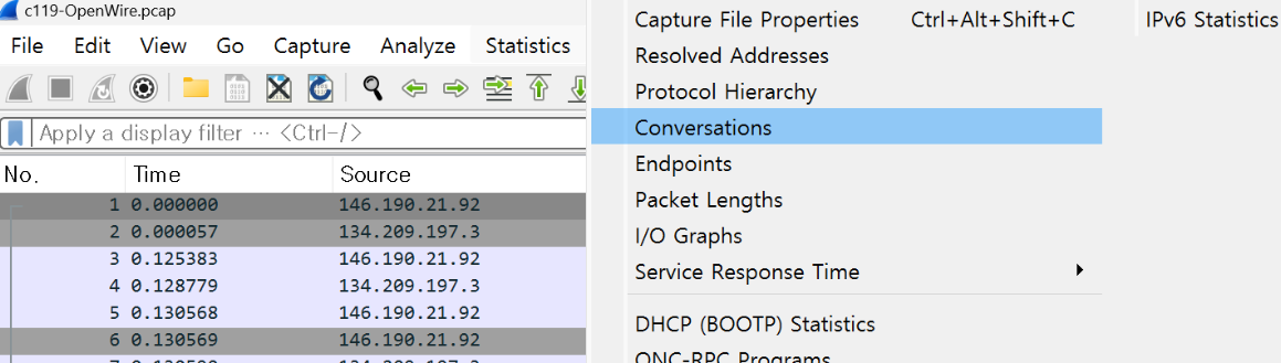 wireshark - statistics - conversations - IPv4 으로 확인할 수 있다.