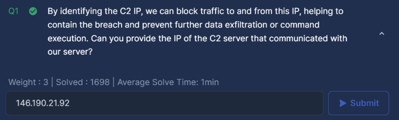 By identifying the C2 IP, we can block traffic to and from this IP, helping to contain the breach and prevent further data exfiltration or command execution. Can you provide the IP of the C2 server that communicated with our server?