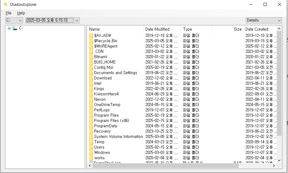 - Shadow Explorer 프로그램을 실행하면, 현재 시스템에 존재하는 볼륨 섀도 복사본 목록이 표시됩니다.