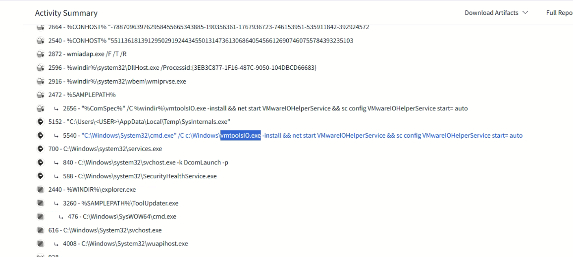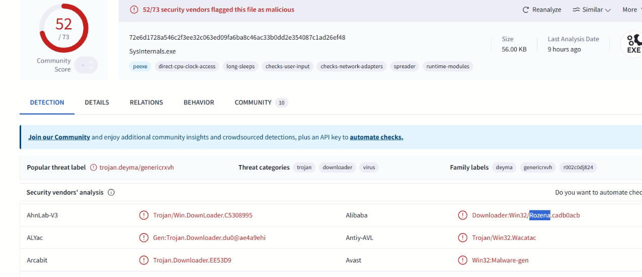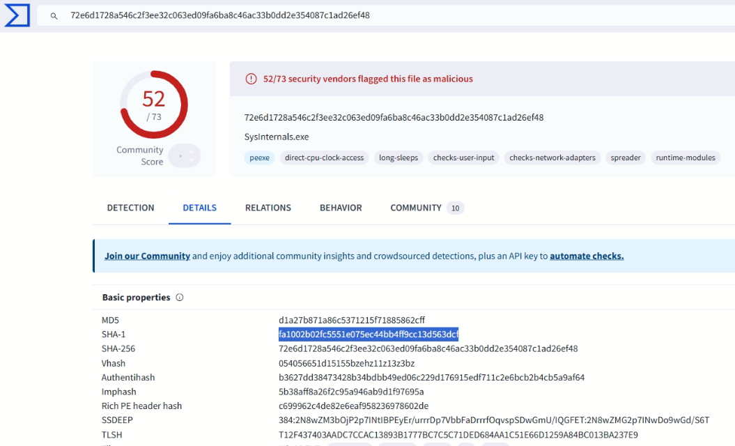 In VirusTotal, check the 'Behavior' tab and observe the 'Process Tree' to track the executables spawned by 'Sysinternals.exe.' 이걸 보고 virustotal을 뒤졌고 아래와 같이 찾을 수 있었다.