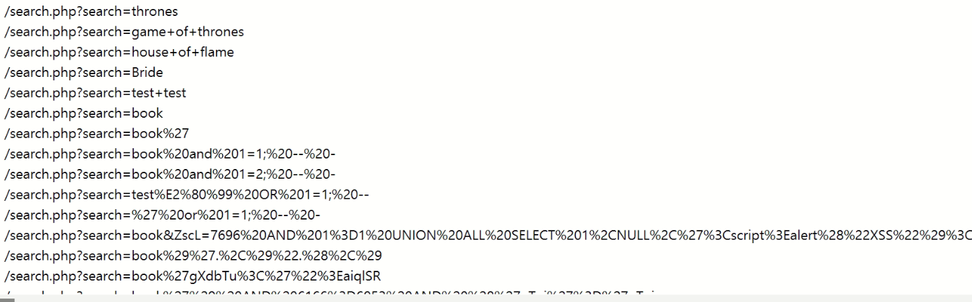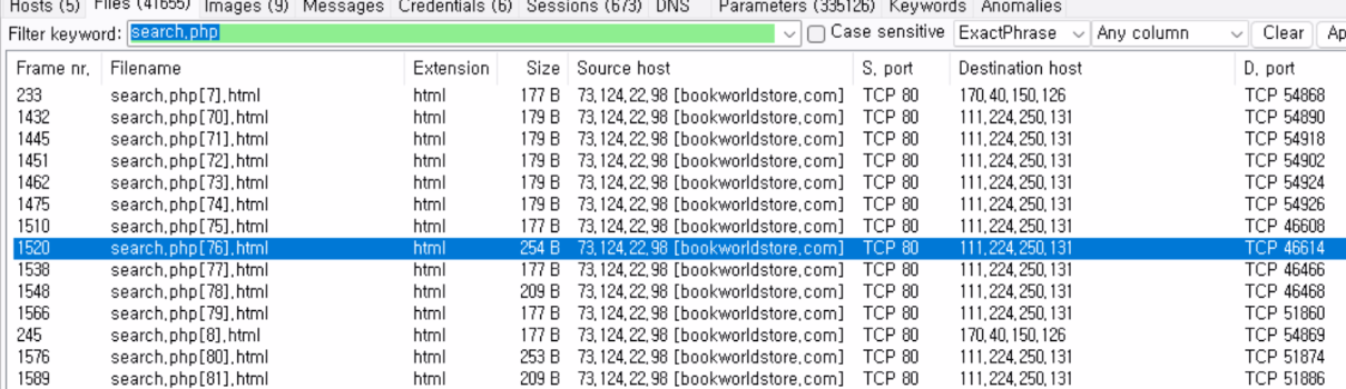 이런 것을 봤을 때 sql injection 공격을 당하고 있다고를 예상할 수 있고 취약한 페이지는 search.php인 것을 확인할 수 있었다.