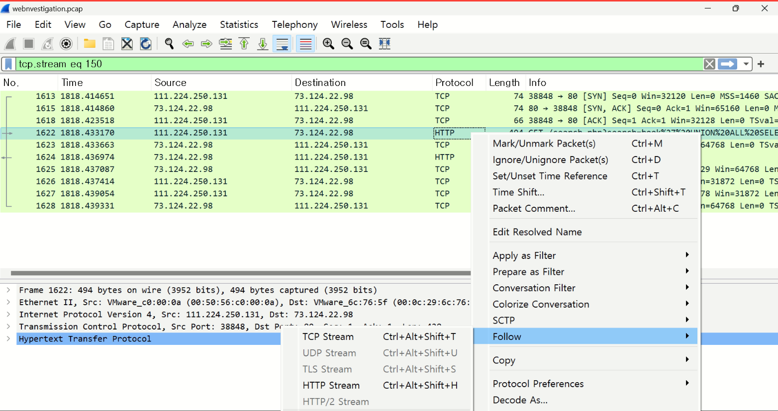 안에 sql query를 보기 힘드니 해당 packet을 우클릭 follow -> http stream에서 아래와 같이 편히 복사를 해준다.