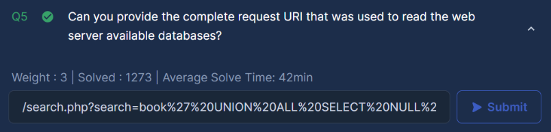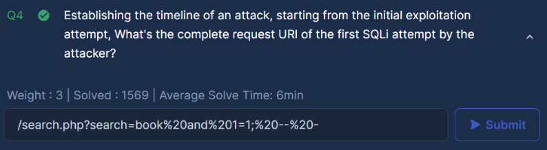 Establishing the timeline of an attack, starting from the initial exploitation attempt, What's the complete request URI of the first SQLi attempt by the attacker?