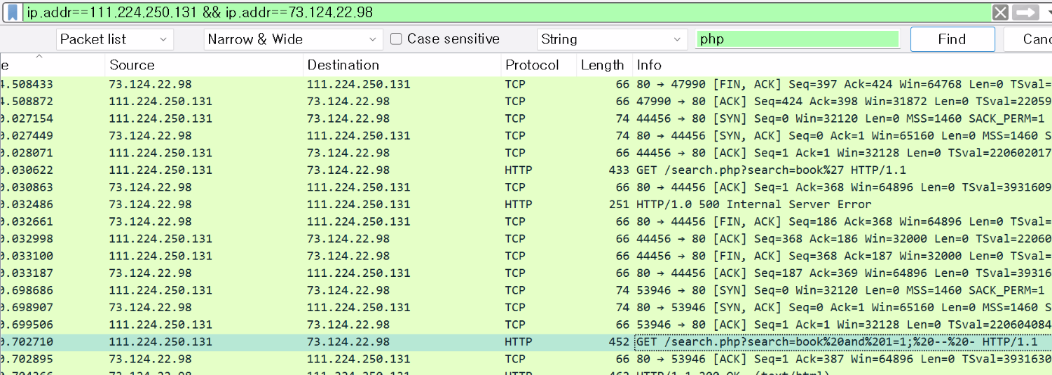 해당질문은 가장 처음 시도한 sql query를 찾는 문제이다. 그렇기에 공격자와 피해자의 주소만 나오게 검색을 하고 string으로는 취약한 페이지가 .php이기 때문에 php를 검색해준다. 그러고 내려가다 가장 처음으로 sql query를 사용하여 검색을 시도 한 것을 찾으면 된다.