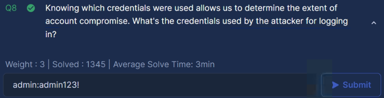 Knowing which credentials were used allows us to determine the extent of account compromise. What's the credentials used by the attacker for logging in?
