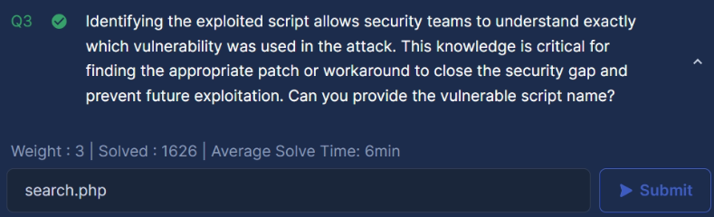 Identifying the exploited script allows security teams to understand exactly which vulnerability was used in the attack. This knowledge is critical for finding the appropriate patch or workaround to close the security gap and prevent future exploitation. Can you provide the vulnerable script name?