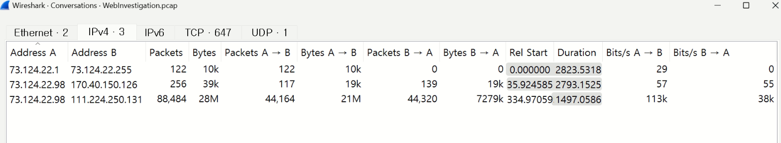 그래서 statistics의 conversatinons에서 통계를 확인해보니 위 사진에서의 ip와 통신량이 월등히 많았다.