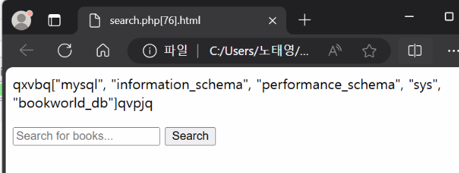 취약한 페이지인 search.php를 검색하고 일일히 사이트를 확인해보니 아래와 같이 데이터베이스 정보를 보여주는 페이지가 나왔다.